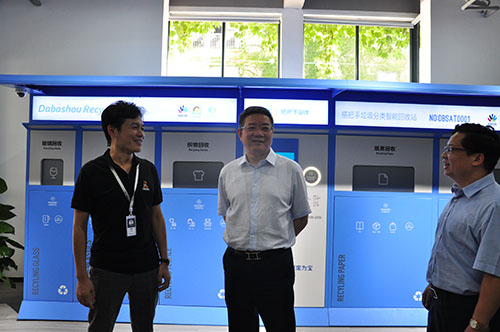 傅區(qū)長一行參觀了寧波市工業(yè)物聯(lián)網(wǎng)特色產(chǎn)業(yè)園柯力啟動(dòng)園展廳和園區(qū)澄豐科技公司的“搭把手”智能回收箱,了解園區(qū)建設(shè)進(jìn)展。