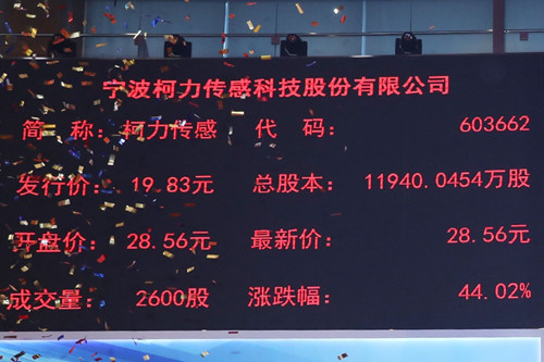 2019年8月6日,柯力傳感(股票代碼:603662)正式在上交所掛牌上市,N柯力以19.83元/股開盤,強(qiáng)勢(shì)封漲停板,首日漲幅達(dá)44.02%。公司本次公開發(fā)行2985.0114萬股,發(fā)行市盈率22.98倍,是寧波轄區(qū)在A股上市的第79家企業(yè),是上交所第1488家掛牌企業(yè)。
